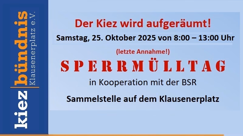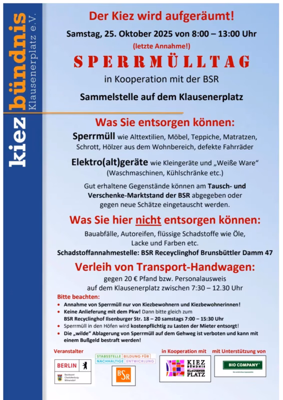 Abgabe von Sperrmüll und Elektrogeräten sowie Tausch- und Verschenke-Marktstand der BSR19. Oktober 2025Aktuelles Vorheriger Beitrag Herbst-Straßenflohmarkt im Klausenerplatz-Kiez Nächster Beitrag Neuer Vorstand des Kiezbündnis Klausenerplatz e.V.